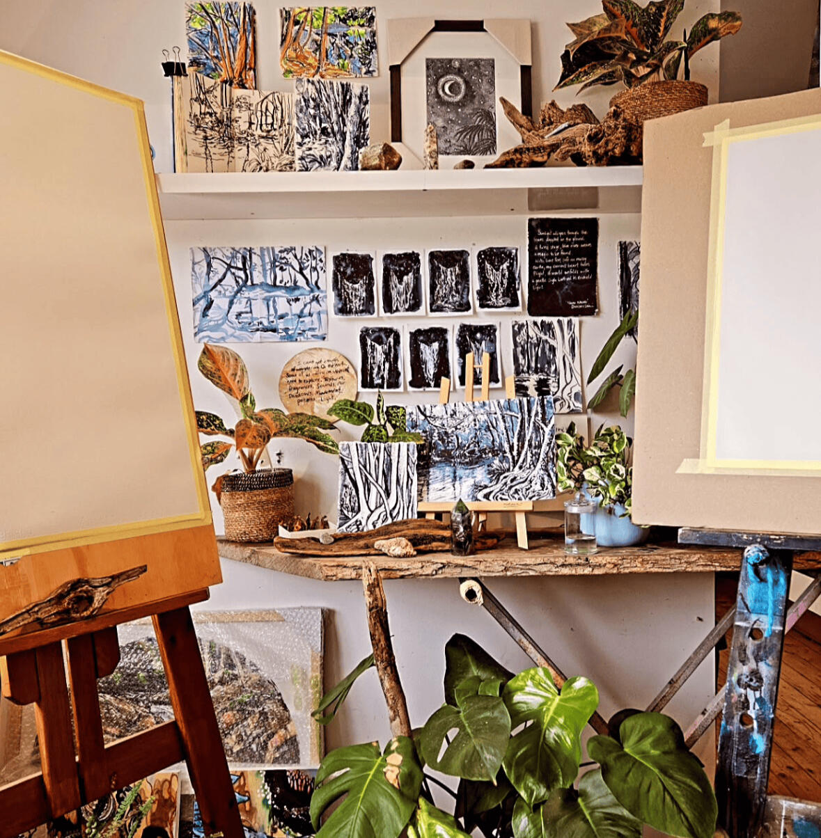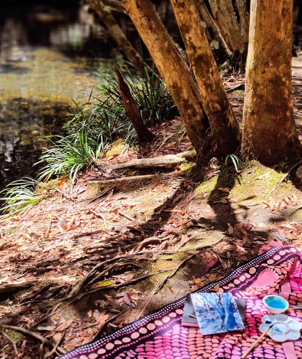 My process is an act of discovery, of curiosity and play. It starts in the noticing, the immersion in nature. Gathering materials, moments and filtering through my imagination and dreams.I am drawn to a a variety of mediums and materials to capture movement, light, texture and rhythm. Rituals of adding elements from the source of inspiration.From paper carving and cutting, painting and assemblage, making inks and pigments sourced from site, or embedding foraged natural items, this is a dialogue between hands, heart and nature.
